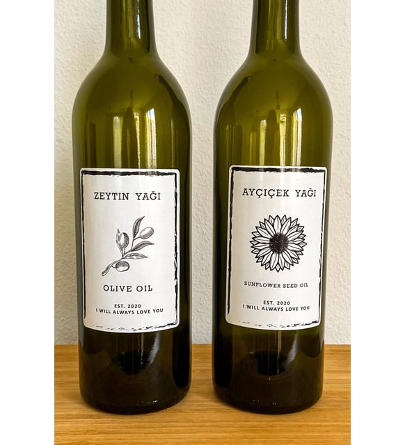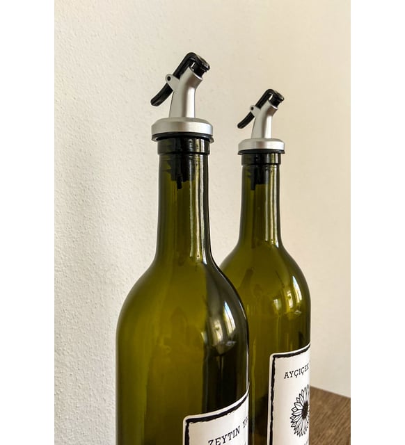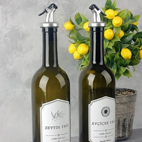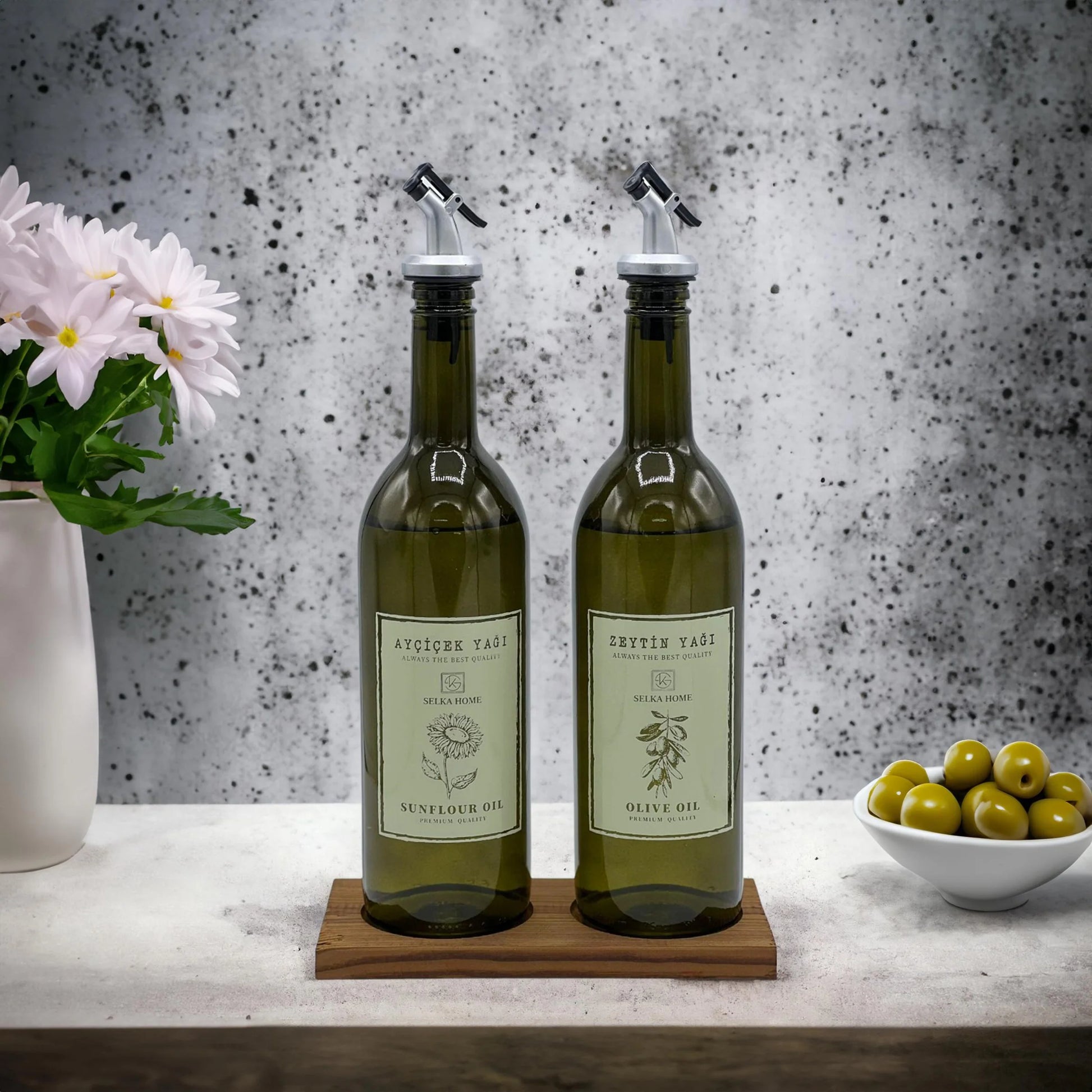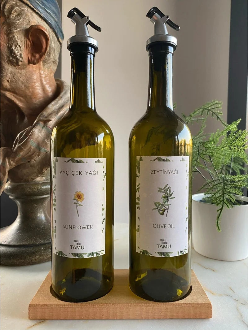 2li Ahşap Stantlı Cam Amber Yağdanlık Zeytinyağı & Ayçiçek Yağı Etiketli